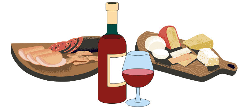 Ti aspettano quattro calici di vino e tante prelibatezze locali, tra cui salumi e formaggi.